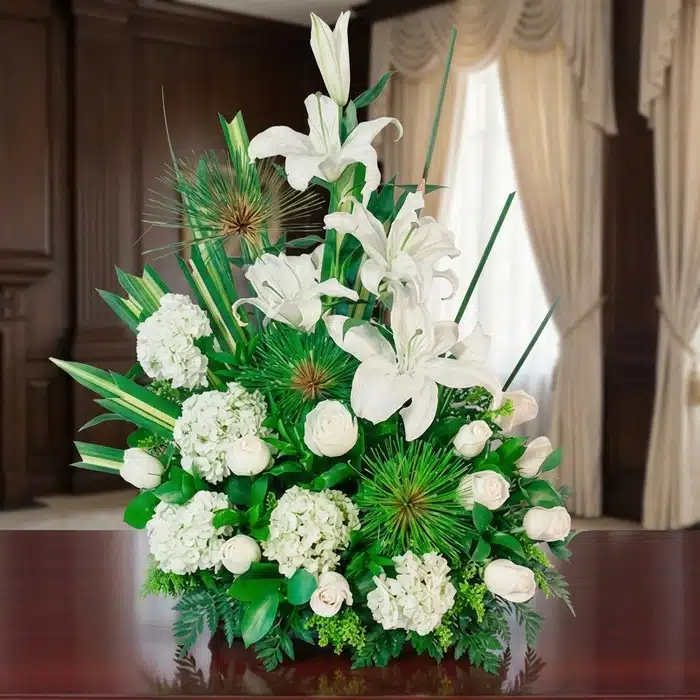 Este hermoso Arreglo Fúnebre Adiós Para Siempre esta finamente arreglado con Rosas, Lirios y Hortensias blancas.